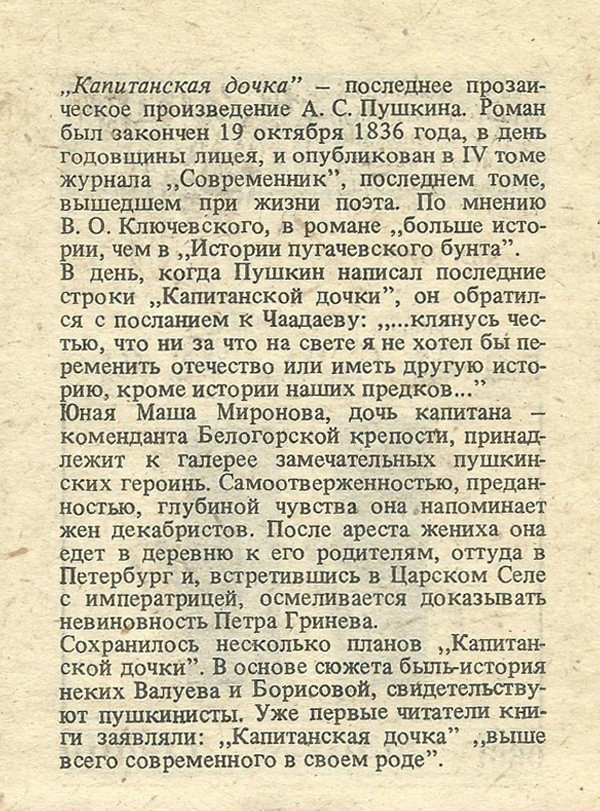 «Капитанская дочка» — последнее прозаическое произведение А. С. Пушкина. Роман был закончен 19 октября 1836 года, в день годовщины лицея, и опубликован в IV томе журнала „Современник”, последнем томе, вышедшем при жизни поэта. По мнению В. О. Ключевского, в романе „больше истории, чем в „Истории пугачевского бунта”.