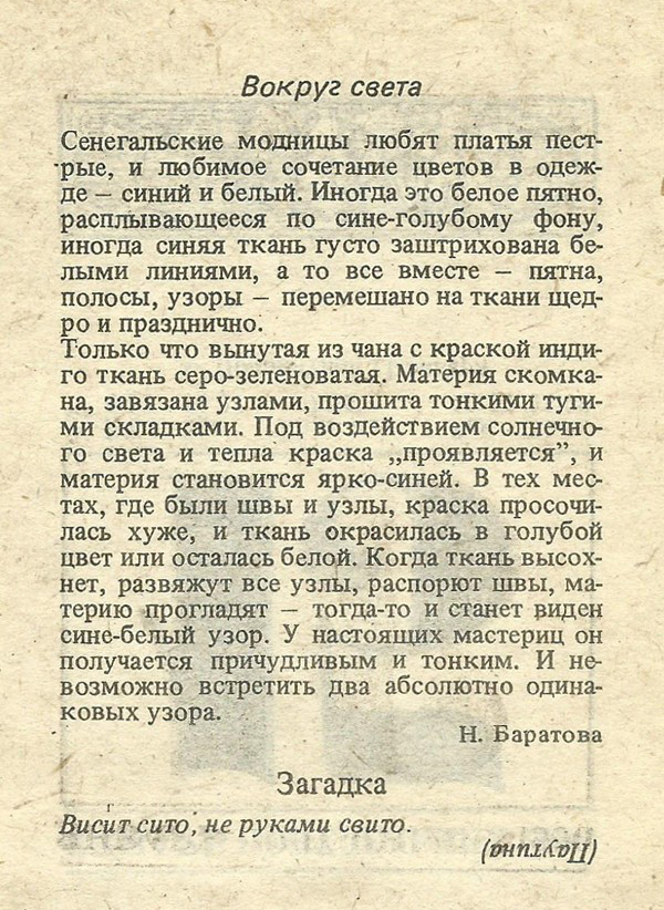 Сенегальские модницы любят платья пестрые, и любимое сочетание цветов в одежде — синий и белый. Иногда это белое пятно, расплывающееся по сине-голубому фону, иногда синяя ткань густо заштрихована белыми линиями, а то все вместе — пятна, полосы, узоры — перемешано на ткани щедро и празднично.