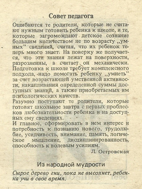 Ошибаются те родители, которые не считают нужным готовить ребенка к школе, и те, которые загромождают детское сознание большим количеством не по возрасту „умных” сведений, считая, что их ребенок теперь много знает. На поверку же получается, что эти знания лежат на поверхности, разрозненны, а считает он механически. Подготовка к школе требует комплексного подхода, надо помогать ребенку „умнеть” за счет возрастающей умственной активности, накапливания определенной суммы доступных знаний, а также приобретаемых им психологических качеств.