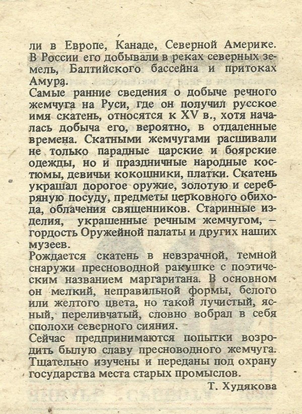 О существовании речного жемчуга мы знаем сегодня лишь благодаря литературе да музейным экспонатам. А ведь в недалеком прошлом жемчугом изобиловали северные реки и озера обоих полушарий. Его находи-