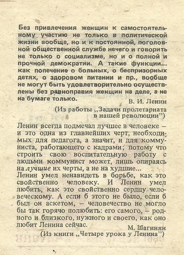 Без привлечения женщин к самостоятельному участию не только в политической жизни вообще, но и к постоянной, поголовной общественной службе нечего и говорить не только о социализме, но и о полной и прочной демократии. А такие функции… как попечение о больных, о беспризорных детях, о здоровом питании и пр., вообще не могут быть удовлетворительно осуществлены без равноправия женщин на деле, а не на бумаге только.