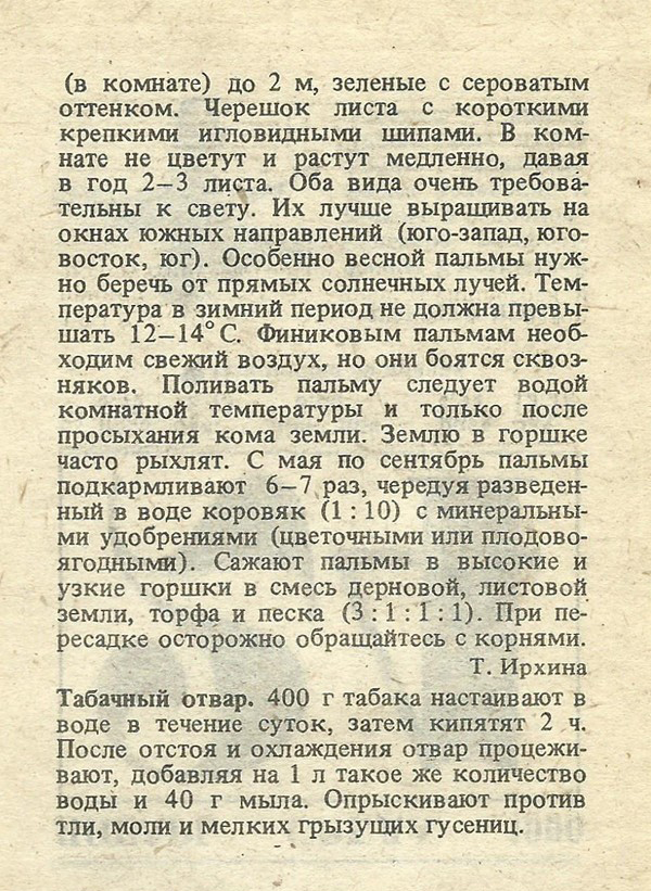 (в комнате) до 2 м, зеленые с сероватым оттенком. Черешок листа с короткими крепкими игловидными шипами. В комнате не цветут и растут медленно, давая в год 2-3 листа. Оба вида очень требовательны к свету. Их лучше выращивать на окнах южных направлений (юго-запад, юго- восток, юг). Особенно весной пальмы нужно беречь от прямых солнечных лучей. Температура в зимний период не должна превышать 12-14° С. Финиковым пальмам необходим свежий воздух, но они боятся сквозняков. Поливать пальму следует водой комнатной температуры и только после просыхания кома земли. Землю в горшке часто рыхлят. С мая по сентябрь пальмы подкармливают 6-7 раз, чередуя разведенный в воде коровяк (1 : 10) с минеральными удобрениями (цветочными или плодово- ягодными). Сажают пальмы в высокие и узкие горшки в смесь дерновой, листовой земли, торфа и песка (3 : 1 : 1 :1). При пересадке осторожно обращайтесь с корнями.
