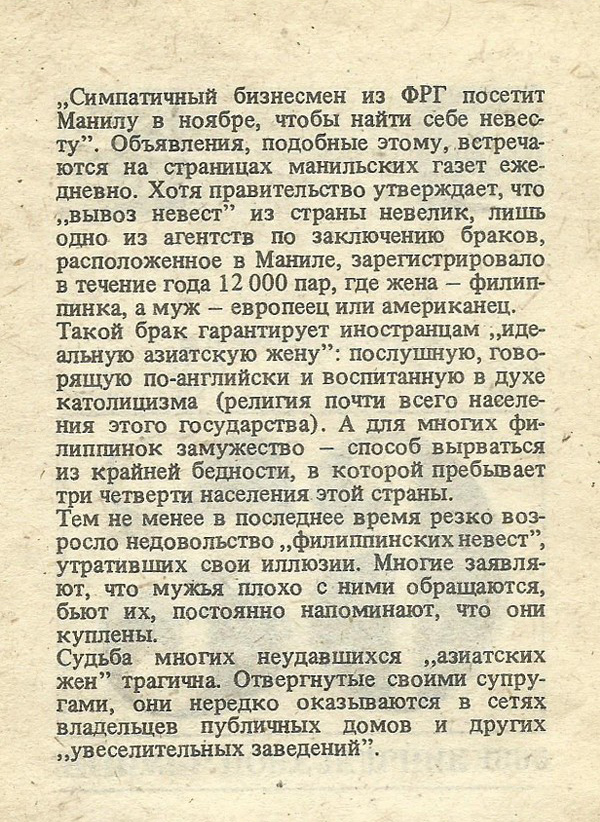 „Симпатичный бизнесмен из ФРГ посетит Манилу в ноябре, чтобы найти себе невесту”. Объявления, подобные этому, встречаются на страницах манильских газет ежедневно. Хотя правительство утверждает, что „вывоз невест” из страны невелик, лишь одно из агентств по заключению браков, расположенное в Маниле, зарегистрировало в течение года 12000 пар, где жена — филиппинка, а муж — европеец или американец. Такой брак гарантирует иностранцам „идеальную азиатскую жену”: послушную, говорящую по-английски и воспитанную в духе католицизма (религия почти всего населения этого государства). А для многих филиппинок замужество — способ вырваться из крайней бедности, в которой пребывает три четверти населения этой страны.