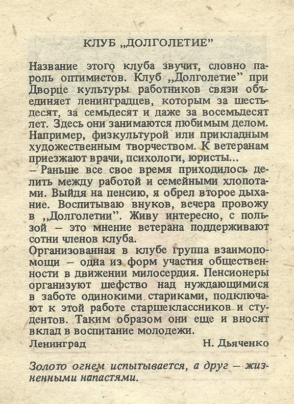 Название этого клуба звучит, словно пароль оптимистов. Клуб „Долголетие” при Дворце культуры работников связи объединяет ленинградцев, которым за шестьдесят, за семьдесят и даже за восемьдесят лет. Здесь они занимаются любимым делом. Например, физкультурой или прикладным художественным творчеством. К ветеранам приезжают врачи, психологи, юристы…