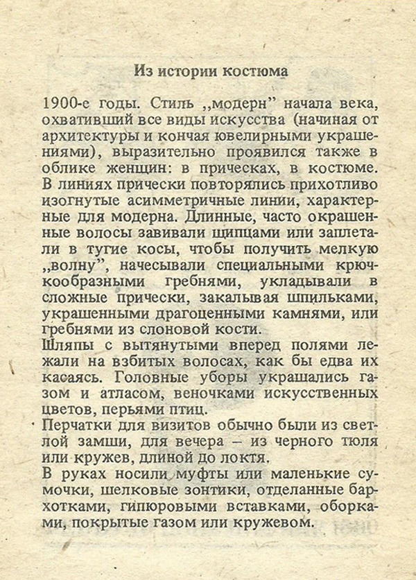 1900-е годы. Стиль „модерн” начала века, охвативший все виды искусства (начиная от архитектуры и кончая ювелирными украшениями), выразительно проявился также в облике женщин: в прическах, в костюме. В линиях прически повторялись прихотливо изогнутые асимметричные линии, характерные для модерна. Шинные, часто окрашенные волосы завивали щипцами или заплетали в тугие косы, чтобы получить мелкую „волну”, начесывали специальными крючкообразными гребнями, укладывали в сложные прически, закалывая шпильками, украшенными драгоценными камнями, или гребнями из слоновой кости.