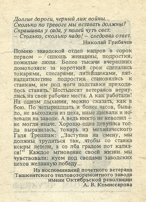 Помню заводской отдел кадров в сорок первом — сплошь женщины, подростки, пожилые люди. Более тысячи вчерашних домохозяек за короткий срок сделались токарями, слесарями, литейщиками, пятнадцатилетние подростки становились к станкам, им под ноги подставки приходилось ставить. Шестьдесят ветеранов вернулись на свои рабочие места. А как работали! На одном дыхании, можно сказать, как в бою. По четырнадцать и более часов, бывало, не выходили из цеха, иные дневали и ночевали на заводе. А ведь никто не неволил — не могли иначе. Хорошо одна девушка тогда выразилась, токарь из механического Галя Трешпак: „Заступив на смену, мы должны трудиться так, чтобы со станка искры летели, а со лба градом пот катился!” Каждое мгновение своей жизни, мы чувствовали: куем под сводами заводских цехов желанную победу…