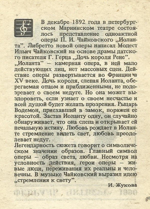 В декабре 1892 года в петербургском Мариинском театре состоялось представление одноактной оперы П. И. Чайковского „Иоланта”. Либретто новой оперы написал Модест Ильич Чайковский на основе драмы датского писателя Г. Герца „Дочь короля Рене”. „Иоланта” — камерная опера, в ней мало действующих лиц, нет массовых сцен. Действие оперы развертывается во Франции в XV веке. Дочь короля, слепая Иоланта, оберегаемая отцом и приближенными, не подозревает о своем недуге. Но она может выздороветь, если узнает о своем несчастье и всей душой будет желать прозрения. Рыцарь Водемон, приехавший в замок, поражен ее красотой. Застав Иоланту одну, он случайно обнаруживает, что она слепа и открывает ей печальную истину. Любовь рождает в Иоланте стремление видеть свет, любовь преодолевает недуг.
