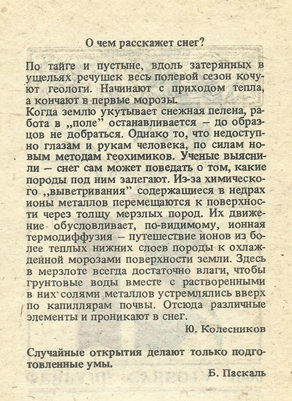 Когда землю укутывает снежная пелена, работа в „поле” останавливается — до образцов не добраться. Однако то, что недоступно глазам и рукам человека, по силам новым методам геохимиков. Ученые выяснили — снег сам может поведать о том, какие породы под ним залегают.