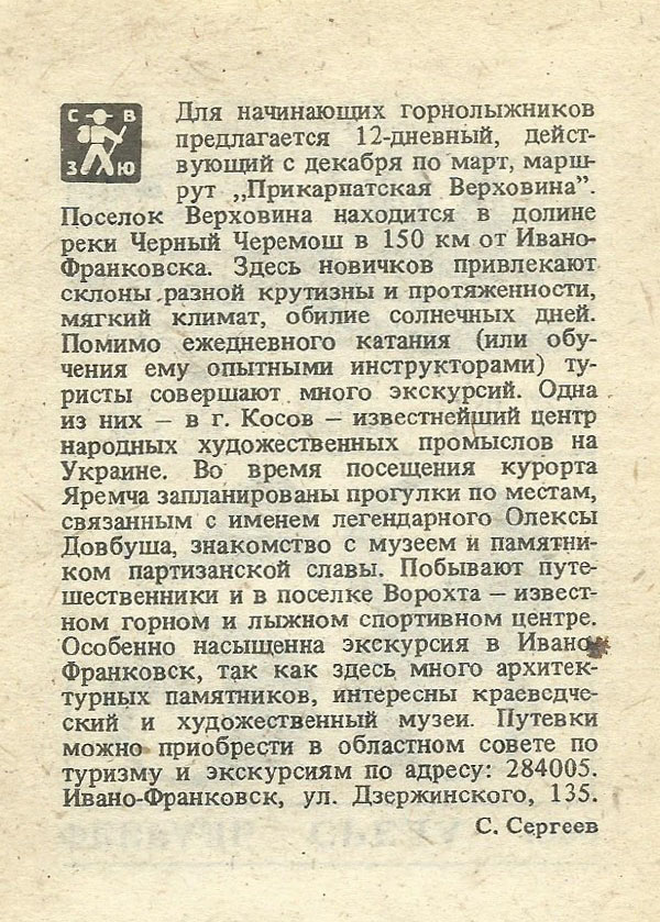 Для начинающих горнолыжников предлагается 12-дневный, действующий с декабря по март, маршрут „Прикарпатская Верховина”. Поселок Верховина находится в долине реки Черный Черемош в 150 км от Ивано- Франковска. Здесь новичков привлекают склоны разной крутизны и протяженности, мягкий климат, обилие солнечных дней. Помимо ежедневного катания (или обучения ему опытными инструкторами) туристы совершают много экскурсий. Одна из них — в г. Косов — известнейший центр народных художественных промыслов на Украине. Во время посещения курорта Яремча запланированы прогулки по местам, связанным с именем легендарного Олексы Довбуша, знакомство с музеем и памятником партизанской славы. Побывают путешественники и в поселке Ворохта — известном горном и лыжном спортивном центре. Особенно насыщенна экскурсия в Ивано-Франковск, так как здесь много архитектурных памятников, интересны краеведческий и художественный музеи. Путевки можно приобрести в областном совете по туризму и экскурсиям по адресу: 284005. Ивано-Франковск, ул. Дзержинского, 135.