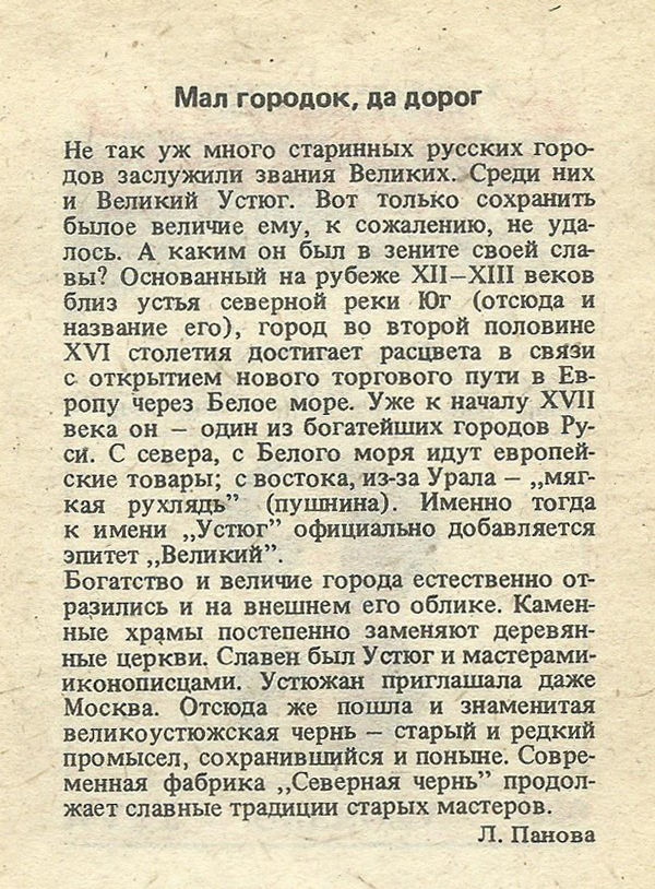 Не так уж много старинных русских городов заслужили звания Великих. Среди них и Великий Устюг. Вот только сохранить былое величие ему, к сожалению, не удалось. А каким он был в зените своей славы? Основанный на рубеже XII—XIII веков близ устья северной реки Юг (отсюда и название его), город во второй половине XVI столетия достигает расцвета в связи с открытием нового торгового пути в Европу через Белое море. Уже к началу XVII века он — один из богатейших городов Руси. С севера, с Белого моря идут европейские товары; с востока, из-за Урала — „мягкая рухлядь” (пушнина). Именно тогда к имени „Устюг” официально добавляется эпитет „Великий”.
