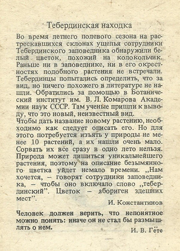 Чтобы дать название новому растению, необходимо как следует описать его. Но для этого потребуется изъять у природы не менее 10 растений, а их нашли очень мало. Сорвать их все сразу в одно лето нельзя. Природа может лишиться уникальнейшего растения, поэтому на описание безымянного цветка уйдет немало времени. „Нам хочется, — говорят сотрудники заповедника, — чтобы оно включало слово „тебердинский”. Цветок — абориген здешних мест”.
