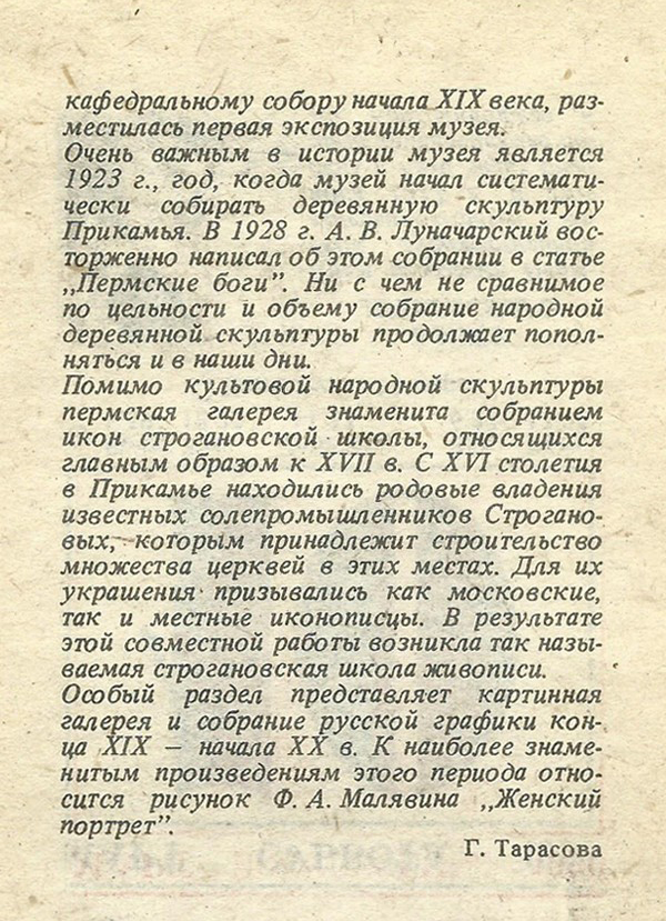 Очень важным в истории музея является 1923 г., год, когда музей начал систематически собирать деревянную скульптуру Прикамья. В 1928 г. А. В. Луначарский восторженно написал об этом собрании в статье «Пермские боги». Ни с чем не сравнимое по цельности и объему собрание народной деревянной скульптуры продолжает пополняться и в наши дни.