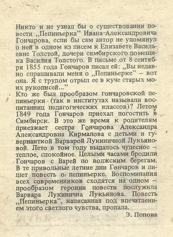 В те привольные летние дни Гончаров и пишет повесть о пепиньерке. Воспоминания всех современников сходятся на одном — прообразом героини повести послужила Варвара Лукинична Лукьянова. Повесть „Пепиньерка”, написанная под впечатлением этого светлого чувства, пропала.