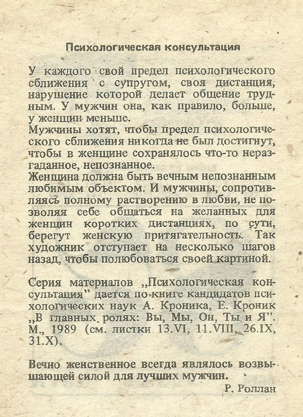 Серия материалов „Психологическая консультация” дается по-книге кандидатов психологических наук А. Кроника, Е. Кроник „В главных ролях: Вы, Мы, Он, Ты, и Я”. М., 1989 (см. листки 13.VI, ll.VIII^26.IX, 31.X).