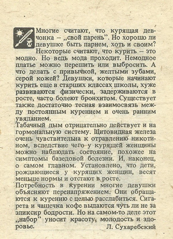 Многие считают, что курящая девчонка — „свой парень”. Но хорошо ли девушке быть парнем, хоть и своим? Некоторые считают, что курить — это модно. Но ведь мода проходит. Немодное платье можно перешить или выбросить. А что делать с привычкой, желтыми зубами, серой кожей? Девушки, которые начинают курить еще в старших классах школы, хуже развиваются физически, задерживаются в росте, часто болеют бронхитом. Существует также достаточно тесная взаимосвязь между постоянным курением и очень ранним увяданием.
