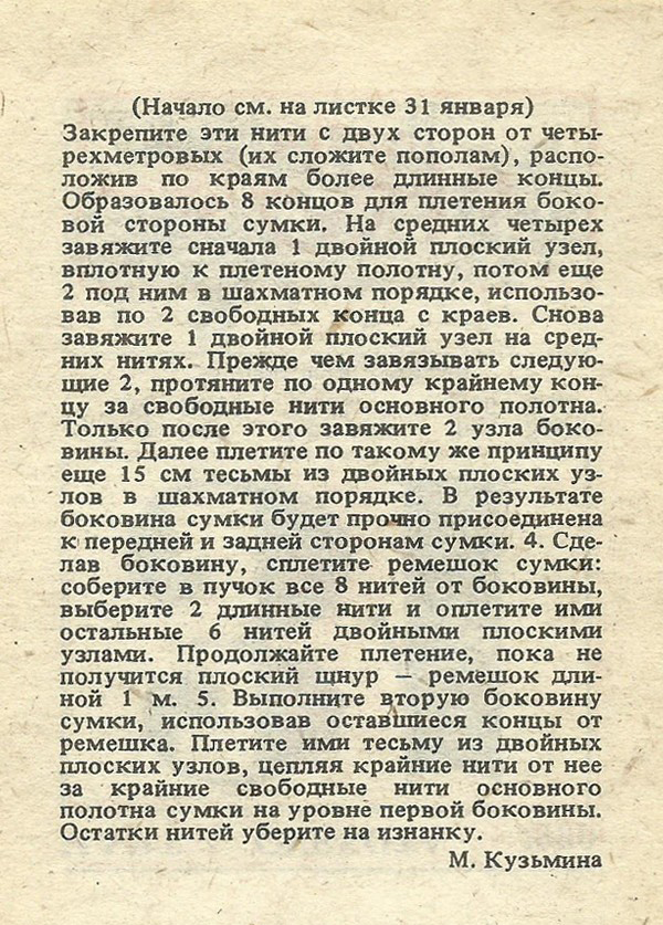Закрепите эти нити с двух сторон от четырехметровых (их сложите пополам), расположив по краям более длинные концы. Образовалось 8 концов для плетения боковой стороны сумки. На средних четырех завяжите сначала 1 двойной плоский узел, вплотную к плетеному полотну, потом еще 2 под ним в шахматном порядке, использовав по 2 свободных конца с краев. Снова завяжите 1 двойной плоский узел на средних нитях. Прежде чем завязывать следующие 2, протяните по одному крайнему концу за свободные нити основного полотна. Только после этого завяжите 2 узла боковины. Далее плетите по такому же принципу еще 15 см тесьмы из двойных плоских узлов в шахматном порядке. В результате боковина сумки будет прочно присоединена к передней и задней сторонам сумки. 4. Сделав боковину, сплетите ремешок сумки: соберите в пучок все 8 нитей от боковины, выберите 2 длинные нити и оплетите ими остальные 6 нитей двойными плоскими узлами. Продолжайте плетение, пока не получится плоский шнур — ремешок длиной 1 м. 5. Выполните вторую боковину сумки, использовав оставшиеся концы от ремешка. Плетите ими тесьму из двойных плоских узлов, цепляя крайние нити от нее за крайние свободные нити основного полотна сумки на уровне первой боковины. Остатки нитей уберите на изнанку.