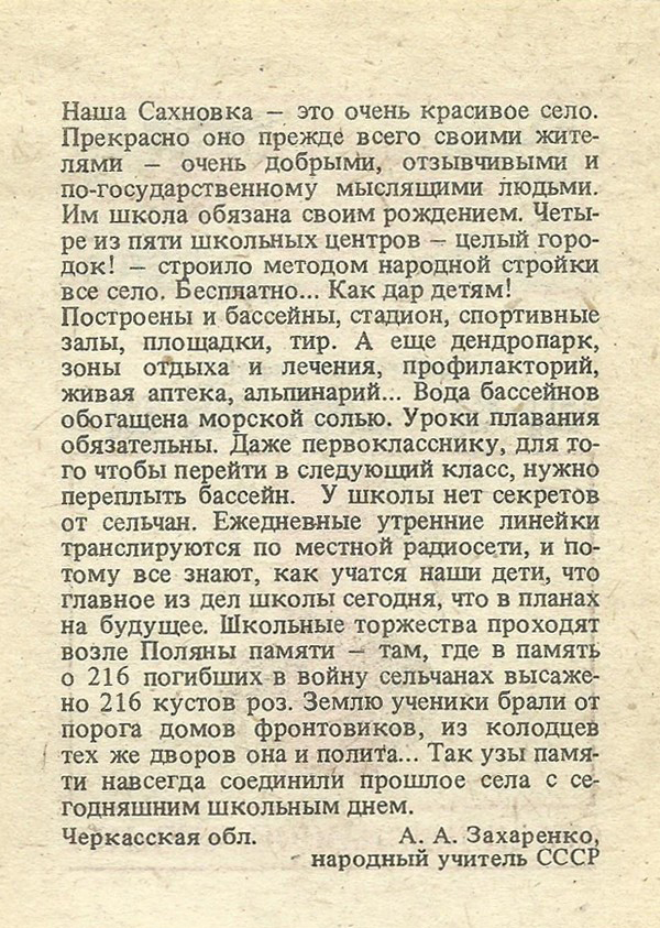 Наша Сахновка — это очень красивое село. Прекрасно оно прежде всего своими жителями — очень добрыми, отзывчивыми и по-государственному мыслящими людьми. Им школа обязана своим рождением. Четыре из пяти школьных центров — целый городок! — строило методом народной стройки все село. Бесплатно… Как дар детям! Построены и бассейны, стадион, спортивные залы, площадки, тир. А еще дендропарк, зоны отдыха и лечения, профилакторий, живая аптека, альпинарий… Вода бассейнов обогащена морской солью. Уроки плавания обязательны. Даже первокласснику, для того чтобы перейти в следующий класс, нужно переплыть бассейн. У школы нет секретов от сельчан. Ежедневные утренние линейки транслируются по местной радиосети, и потому все знают, как учатся наши дети, что главное из дел школы сегодня, что в планах на будущее. Школьные торжества проходят возле Поляны памяти — там, где в память о 216 погибших в войну сельчанах высажено 216 кустов роз. Землю ученики брали от порога домов фронтовиков, из колодцев тех же дворов она и полита… Так узы памяти навсегда соединили прошлое села с сегодняшним школьным днем.