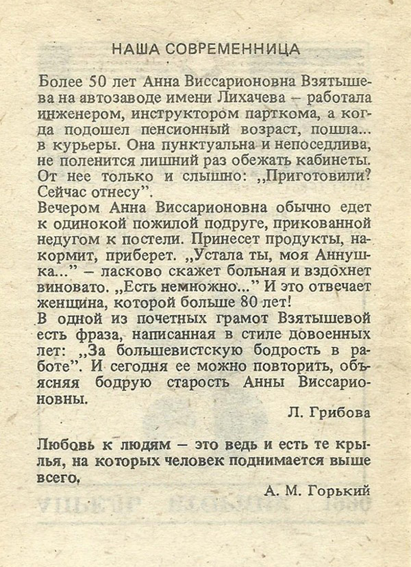 Более 50 лет Анна Виссарионовна Взятышева на автозаводе имени Лихачева — работала инженером, инструктором парткома, а когда подошел пенсионный возраст, пошла… в курьеры. Она пунктуальна и непоседлива, не поленится лишний раз обежать кабинеты. От нее только и слышно: „Приготовили? Сейчас отнесу”.