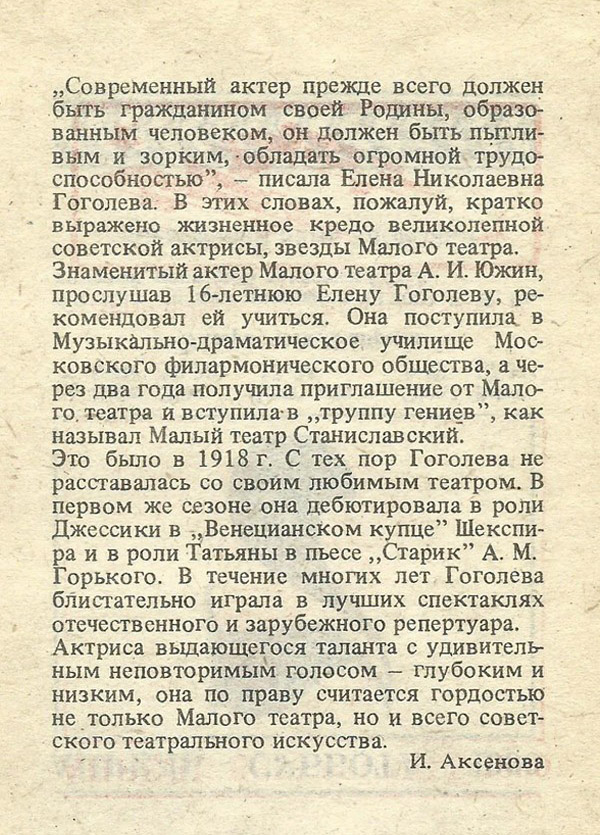 Это было в 1918 г. С тех пор Гоголева не расставалась со своим любимым театром. В первом же сезоне она дебютировала в роли Джессики в „Венецианском купце” Шекспира и в роли Татьяны в пьесе „Старик” А. М. Горького. В течение многих лет Гоголева блистательно играла в лучших спектаклях отечественного и зарубежного репертуара. Актриса выдающегося таланта с удивительным неповторимым голосом — глубоким и низким, она по праву считается гордостью не только Малого театра, но и всего советского театрального искусства.