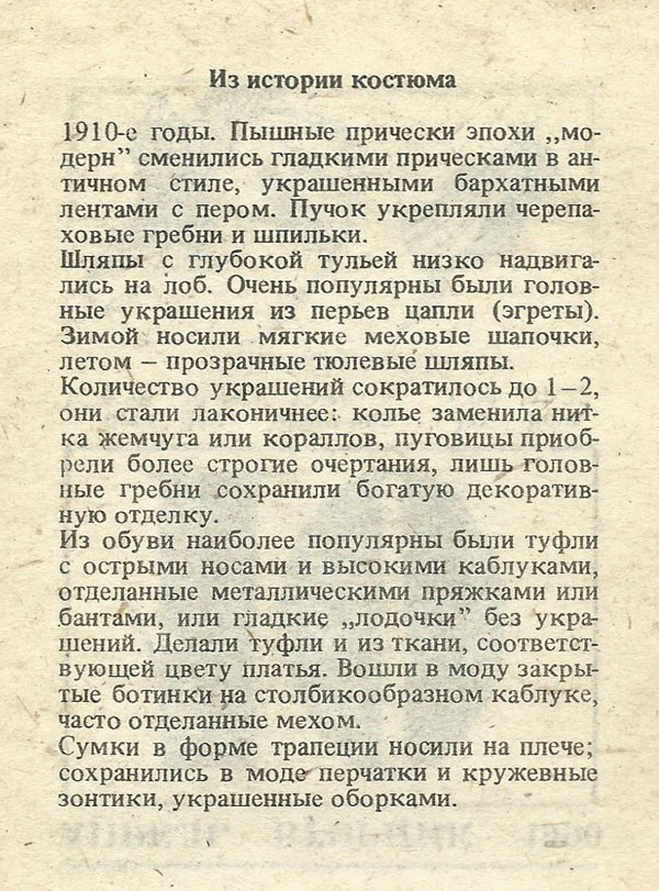 1910-е годы. Пышные прически эпохи „модерн” сменились гладкими прическами в античном стиле, украшенными бархатными лентами с пером. Пучок укрепляли черепаховые гребни и шпильки.