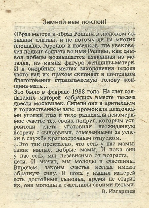 Это было в феврале 1988 года. На слет солдатских матерей собрались вместе тысяча двести москвичек. Сидели они в притихшем и торжественном зале, промокали платочками уголки глаз и тихо разделяли неизмеримое счастье тех своих подруг, которым устроители слета уготовили неожиданную встречу с сыновьями, отмеченными за успехи в службе краткосрочным отпуском.