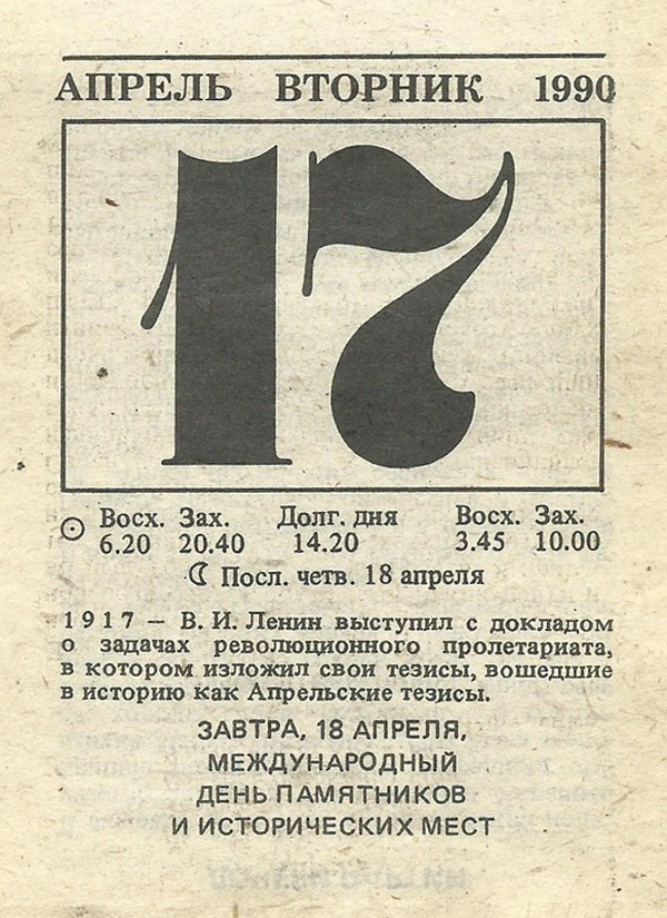 1917 — В. И. Ленин выступил с докладом о задачах революционного пролетариата, в котором изложил свои тезисы, вошедшие в историю как Апрельские тезисы.