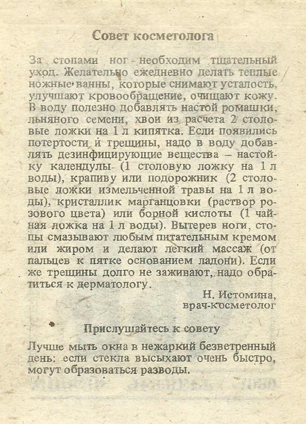 За стопами ног — необходим тщательный уход. Желательно ежедневно делать теплые ножные ванны, которые снимают усталость, улучшают кровообращение, очищают кожу. В воду полезно добавлять настой ромашки, льняного семени, хвои из расчета 2 столовые ложки на 1 л кипятка. Если появились потертости и трещины, надо в воду добавлять дезинфицирующие вещества — настойку календулы (1 столовую ложку на 1 л воды), крапиву или подорожник (2 столовые ложки измельченной травы на 1 л воды), кристаллик марганцовки (раствор розового цвета) или борной кислоты (1 чай- ная ложка на 1 л воды). Вытерев ноги, стопы смазывают любым питательным кремом или жиром и делают легкий массаж (от пальцев к пятке основанием ладони). Если же трещины долго не заживают, надо обратиться к дерматологу.