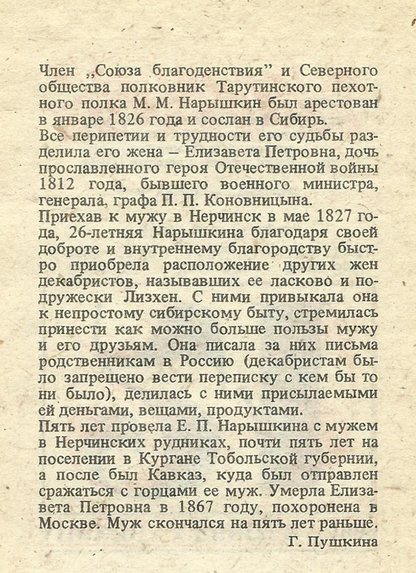 Член „Союза благоденствия” и Северного общества полковник Тарутинского пехотного полка М. М. Нарышкин был арестован в январе 1826 года и сослан в Сибирь.