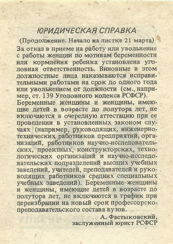 За отказ в приеме на работу или увольнение с работы женщин по мотивам беременности или кормления ребенка установлена уголовная ответственность. Виновные в этом должностные лица наказываются исправительными работами на срок до одного года или увольнением от должности (см., например, ст. 139 Уголовного кодекса РСФСР). Беременные женщины и женщины, имеющие детей в возрасте до полутора лет, не включаются в очередную аттестацию при ее проведении в установленных законом случаях (например, руководящих, инженерно- технических работников предприятий, организаций, работников научно-исследовательских, проектных, конструкторских, технологических организаций и научно-исследовательских подразделений высших учебных заведений, учителей, преподавателей и руководящих работников средних специальных учебных заведений). Беременные женщины и женщины, имеющие детей в возрасте до полутора лет, не включаются в график при переизбрании на новый срок профессорско- преподавательского состава вузов.