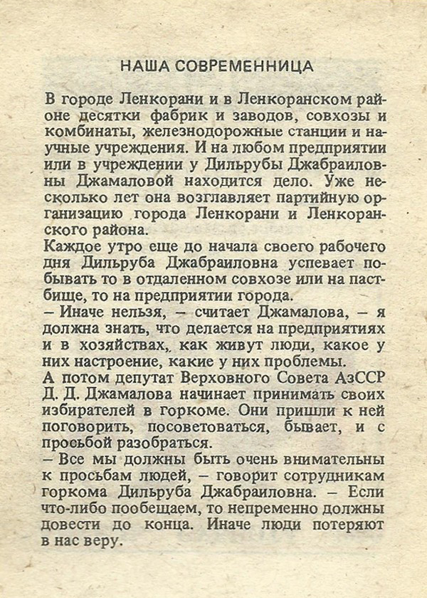 А потом депутат Верховного Совета АзССР Д. Д. Джамалова начинает принимать своих избирателей в горкоме. Они пришли к ней поговорить, посоветоваться, бывает, и с просьбой разобраться.
