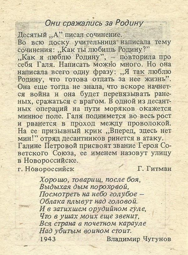 „Как я люблю Родину”, — повторила про себя Галя. Написать можно много. Но она написала всего одну фразу: „Я так люблю Родину, что готова отдать за нее жизнь”. Она еще тогда не знала, что вскоре начнется война и она будет перевязывать раненых, сражаться с врагом. В одной из десантных операций на пути моряков окажется минное поле. Галя поднимется во весь рост и рванется в проход между проволокой. На ее призывный крик „Вперед, здесь нет мин!” отряд десантников ринется в атаку. Галине Петровой присвоят звание Героя Советского Союза, ее именем назовут улицу в Новороссийске.